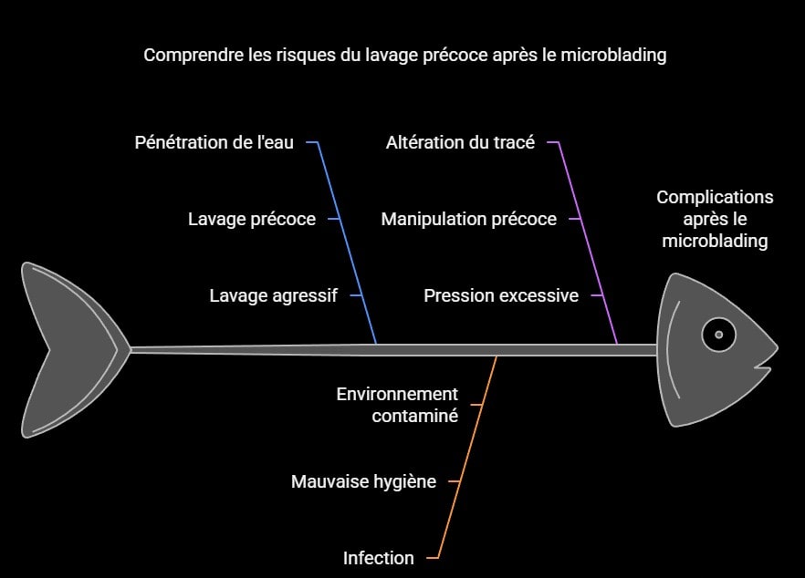 La zone traitée après un microblading est équivalente à une petite plaie ouverte. Un lavage prématuré ou agressif peut avoir des conséquences visibles et durables :